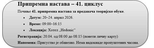 Агенција за безбедност саобраћаја обавештава сва лица заинтересована за похађање припремне наставе за полагање стручног испита за предавача теоријске обуке да ће у 2026. години организовати следеће припремне наставе: